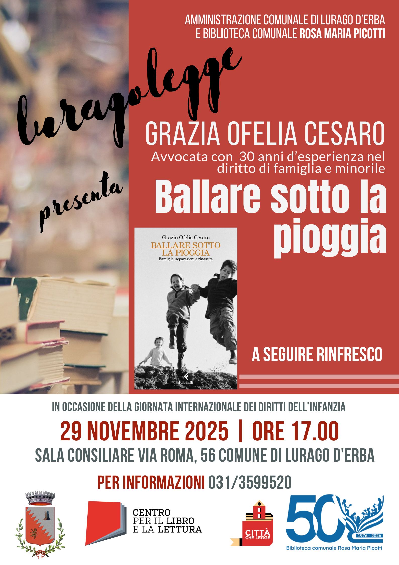 In occasione della Giornata mondiale dei diritti dell'infanzia la Biblioteca Comunale di Lurago d'Erba in collaborazione con l'Amministrazione Comunale è lieta di presentare, nella Sala Consiliare di Lurago d'Erba, il libro Ballare sotto la pioggia di Maria Grazia Cesaro (Feltrinelli). Al termine seguirà un aperitivo durante il quale sarà possibile dialogare con l'autrice.