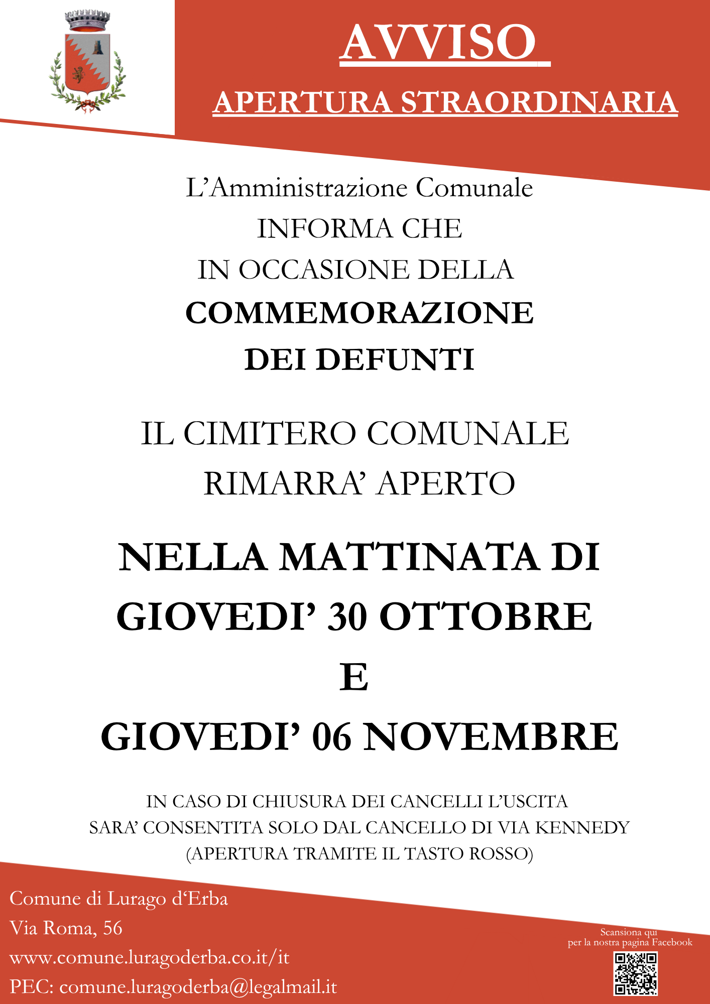 Si avvisano i cittadini che in occasione della commemorazione dei defunti, nelle mattinate di giovedì 30 ottobre 2025 e giovedì 6 novembre 2025 il cimitero comunale rimarrà aperto.
