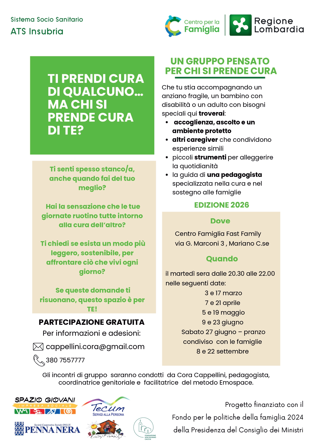 Un calendario di incontri che consentono a chi si prende cura di un familiare con disabilità, sia bambino che adulto, o di un anziano fragile, di sentirsi ascoltato. Un luogo dove condividere fatiche ma anche informazioni e strategie per affrontare la quotidianità della cura. Uno spazio per sè, per recuperare energie e sentirsi meno soli con il sostegno del gruppo.