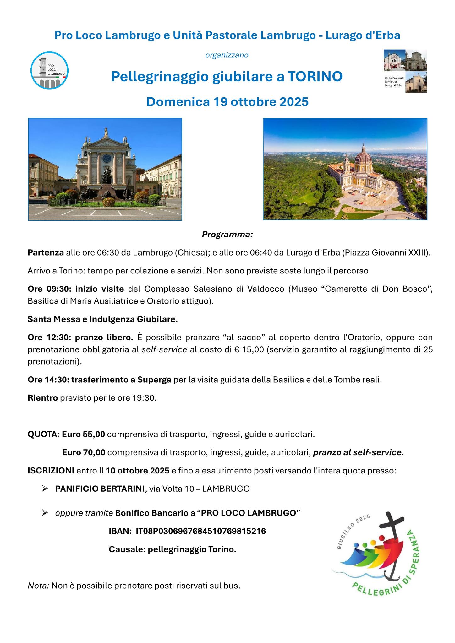 Domenica 19 ottobre 2025 si svolgerà il Pellegrinaggio giubilare a Torino organizzato da Unità Pastorale Lambrugo - Lurago d'Erba e Pro Loco Lambrugo.
