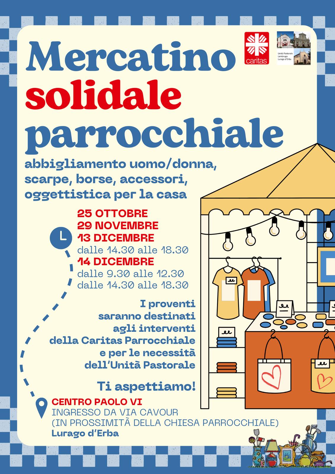 La Caritas Parrocchiale organizza il MERCATINO SOLIDALE presso il Centro Paolo VI, in via Cavour a Lurago d'Erba come da calendario allegato.